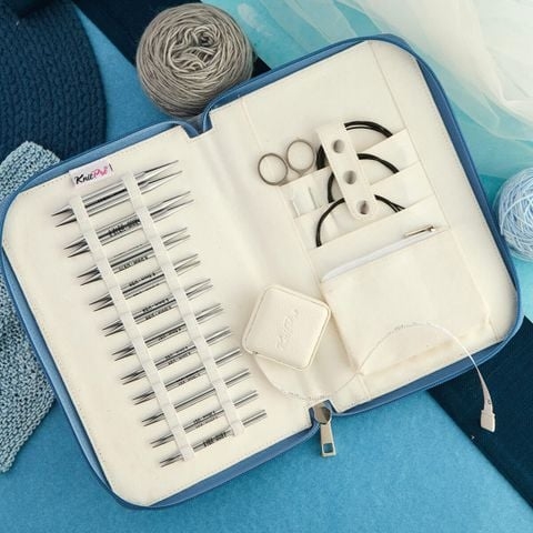 This Regal set offers 11 popular Nova Metal needle sizes in 2 length options – 13 cm (5") and 10 cm (4") to tackle a variety of projects. The secure connectors guarantee a seamless join, free from snags or interruptions. Plus, a handy blue fabric case keeps everything organized and accessible, making it your go-to knitting companion!