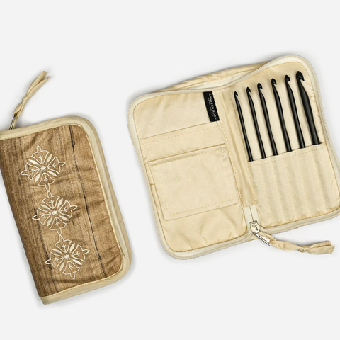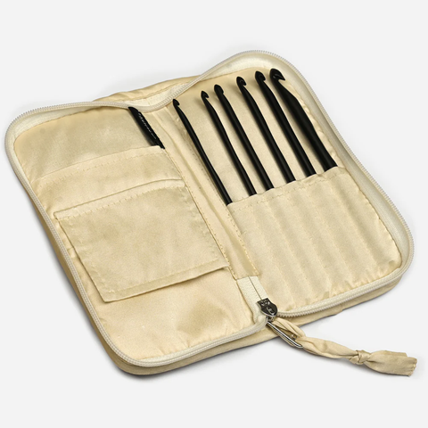 The Radiance set of single-ended crochet hooks is beautiful and practical, featuring six popular US sizes G - L (4 - 8 mm) and housed in an elegant Khadi silk case. Multiple pockets allow you to keep your crochet accessories, such as stitch markers or scissors, organized and within reach as you work on your latest project. With the Radiance set under your belt, you'll be able to bring your crochet projects to life like never before.