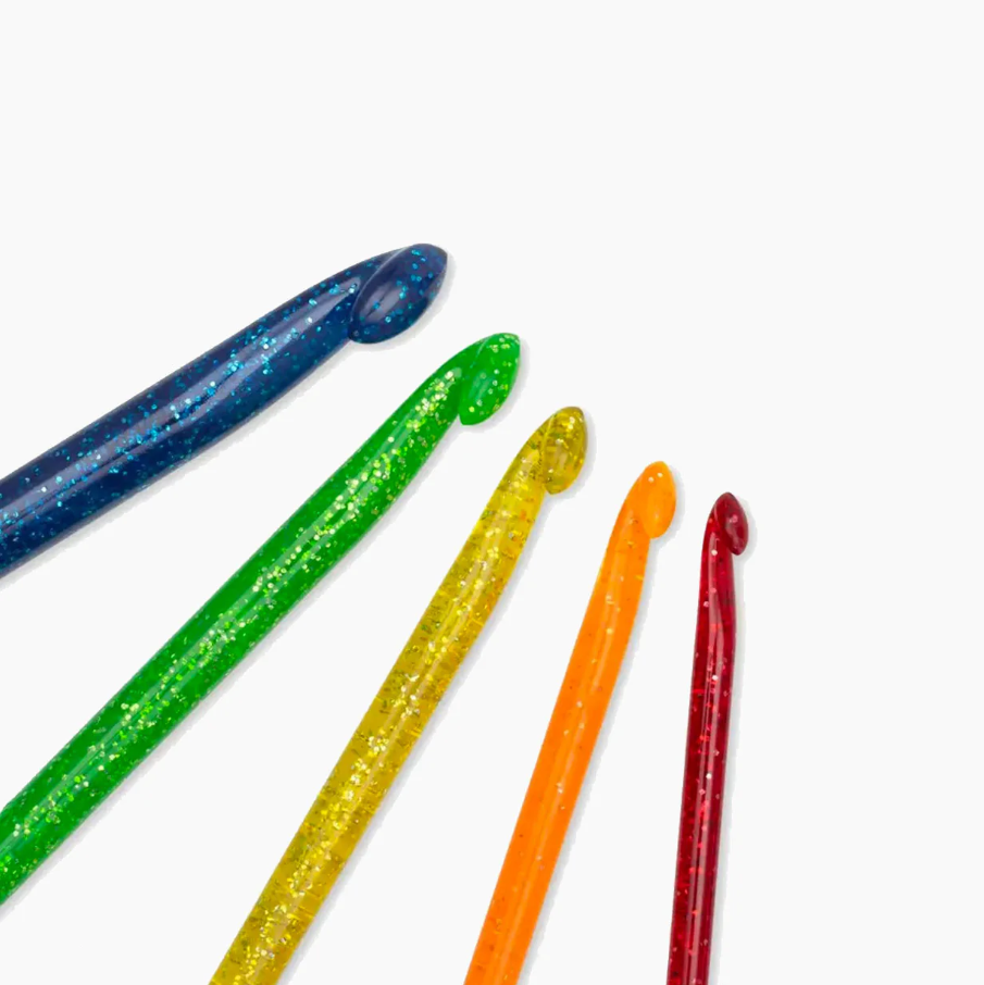 Dành cho những người hâm mộ đan móc ở mọi độ tuổi, những người yêu thích màu sắc! Bộ kim móc Pop có 5 kim móc chắc chắn với nhiều màu sắc và kích thước khác nhau. Điểm nổi bật: mỗi kim móc màu đỏ, cam, vàng, xanh lá cây và xanh lam đều có các hạt lấp lánh bên trong thân móc. Các kim móc được làm bằng nhựa và có bề mặt nhẵn để chỉ có thể trượt hoàn hảo - giúp việc may vá nhẹ nhàng, thoải mái. Các kim màu dài 18 cm và có kích thước từ 5 mm đến 10 mm.