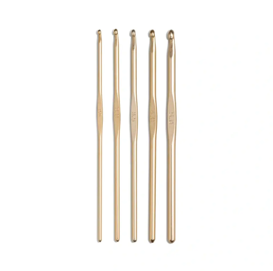 Crochet with the modern look! These sets of crochet hooks for wool each contain five crochet hooks in the new trendy colours new gold or gunmetal. These two attractive colours are available only in these sets! And of course, they come in popular gauges from 2.50 mm to 5.00 mm, so that you can start your next crochet project straight away. The guide surface on the shaft ensures that the hook does not slip in your hand and reliably lets you crochet with ease and precision. Thanks to the very smooth surface and the perfect shape of the hook, the yarn is guided evenly; in this way, this wonderfully light, aluminium crochet hook guarantees an even stitch structure. The white background of the practical, durable, plastic storage bag provides a wonderful contrast to the gleaming crochet hooks. The set also makes the perfect gift!