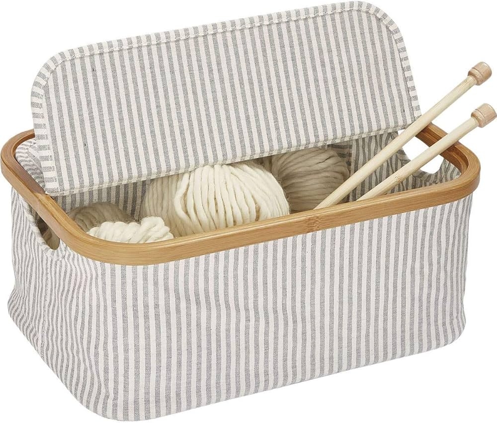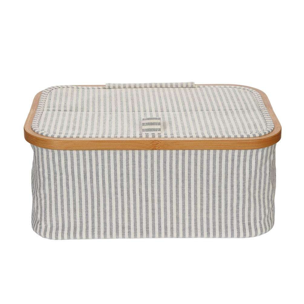 Hộp Canvas gấp kết hợp khung tre là sản phẩm tiên phong khi nói đến sự kết hợp chất liệu thiết thực giữa vải canvas cotton chắc chắn và tre sáng màu. Kiểu dáng sọc hiện đại với màu trắng và xám khiến nó thực sự bắt mắt. Hộp có thể được gấp lại một cách nhanh chóng – tất cả những gì bạn phải làm là lắp các thanh bên trong và cố định chúng vào vị trí bằng móc và dây buộc vòng. Để tiết kiệm không gian cất giữ, các thanh được đặt lại ở đế bên trong và hộp có thể gập lại được. Đảm bảo truy cập nhanh vào các phụ kiện may, đan hoặc móc vì mỗi nửa nắp có thể được mở bằng một vòng vải nhỏ.