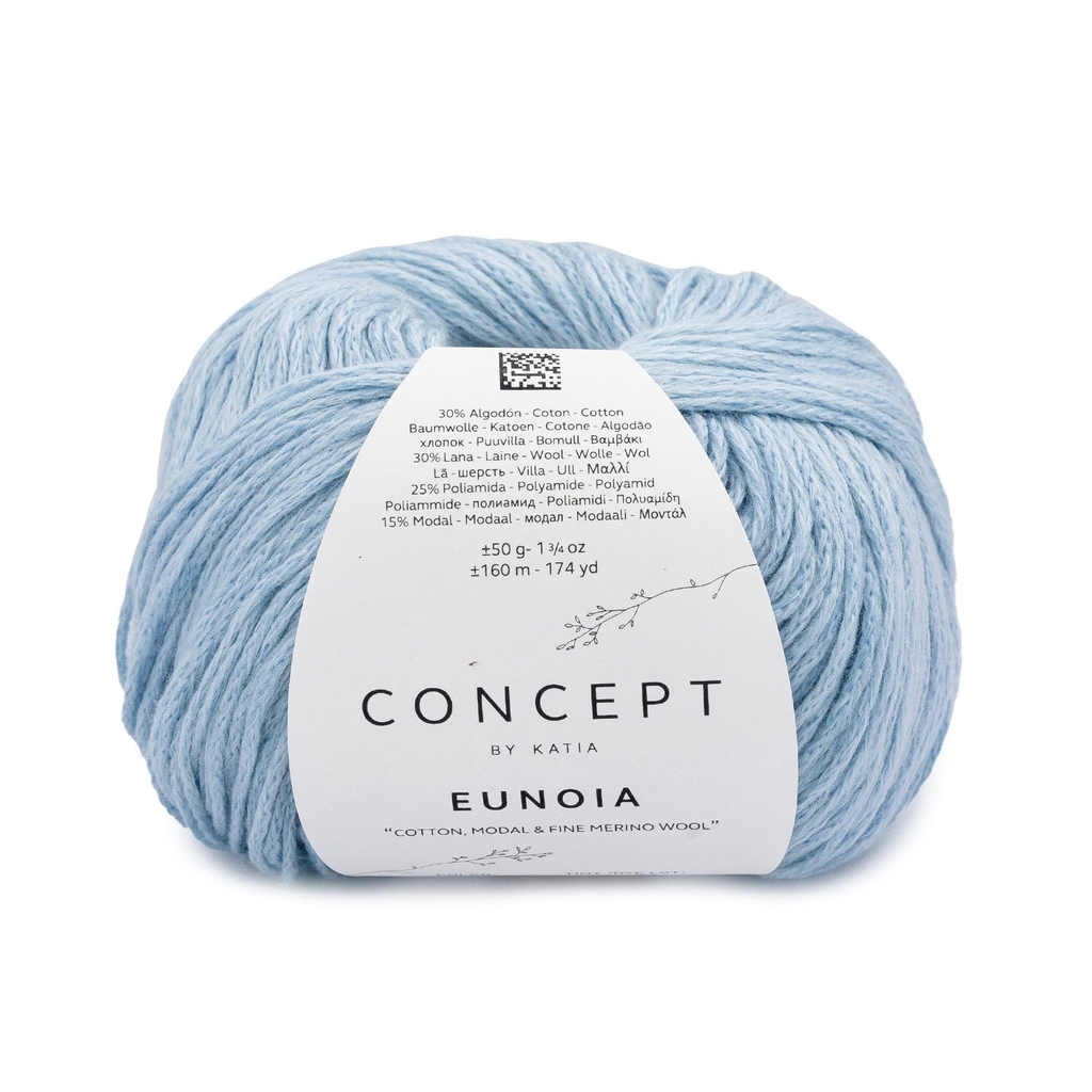 Sợi Katia Eunoia là một sản phẩm thuộc dòng Concept by Katia, nổi bật với sự kết hợp cân bằng giữa các loại sợi tự nhiên và sợi tổng hợp chất lượng cao, lý tưởng để đan móc trang phục có thể mặc quanh năm. Sợi Eunoia có sự pha trộn độc đáo để tối ưu hóa đặc tính cho mọi mùa như 30% Cotton nhằm đảm bảo độ thoáng mát, hút ẩm và mềm mại, 30% Wool cung cấp sự mềm mại, đàn hồi và khả năng giữ ấm, điều chỉnh nhiệt độ cơ thể, 25% Polyamide để tăng cường độ bền, độ đàn hồi và khả năng giữ form cho sản phẩm và 15% Modal (Sợi Modal)giúp tăng thêm độ mềm mượt, sang trọng và khả năng thoáng khí. Vì những tính chất đó mà bạn có thể sử dụng Eunoia quanh năm nhờ sự kết hợp của Cotton (mát) và Wool (ấm), sợi có khả năng điều chỉnh nhiệt độ cơ thể, thích hợp cho cả mùa xuân/hè và mùa thu/đông.