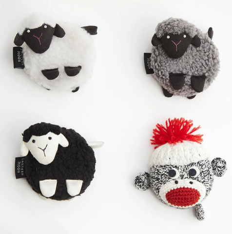 These whimsical merino sheep tape measures come in a variety of natural colors. Metric and English measurements are shown on opposite sides of a 5’ long retractable measure.