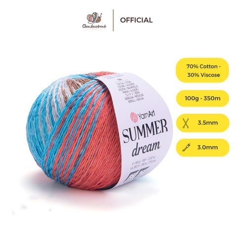 Sợi cotton pha viscose Summer Dream của hãng Yarnart là 1 sản phẩm tuyệt vời để bạn sáng tạo các sản phẩm đan móc mùa hè. Sợi Summer Dream được pha thêm phần óng ánh nhẹ tăng độ nhấn nhá cho sản phẩm thêm đặc sắc. Chất liệu sợi siêu mềm mịn, mát, bóng nhẹ.