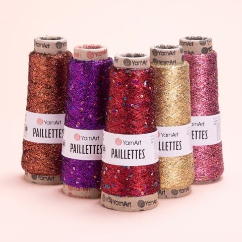 Yarnart Paillettes là loại sợi kết hợp sợi ren kim tuyến và những hạt sequin nhỏ lấp lánh. Paillettes, mà bạn có thể thiết kế các dòng thành phẩm nhẹ và lấp lánh với cách sử dụng đơn giản, thêm kết cấu khác cho các dự án của bạn, đặc biệt là khi bạn đan cùng với sợi cotton hoặc wool. Những hạt sequin lấp lánh trong Paillettes, xuyên suốt 800m cuộn sợi, có đường kính trung bình là 3 mm.