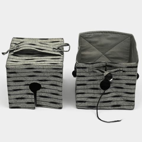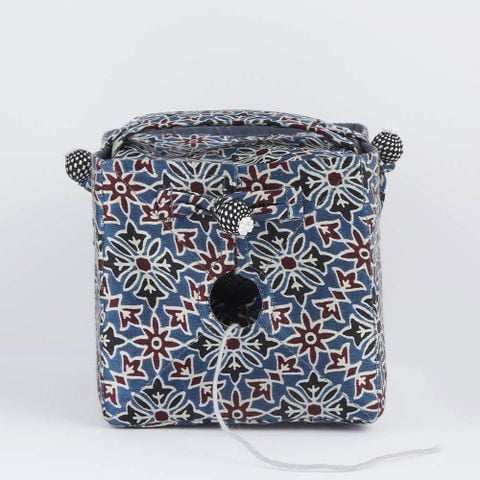 Our popular knit-out box is now available in a sophisticated Ikat fabric that complements all décor. The 5” box was designed to hold and contain individual balls of yarn. A keyhole opening allows yarn to feed out from inside, keeping it free of dirt and entanglement. A closable lid and button-hole closure, with side handles, completes the look of simple elegance.